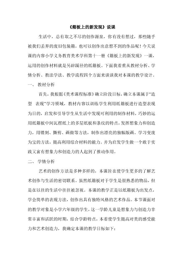 生活中,总有取之不尽的创作源泉,你有没有想过,那些随手被我们丢弃的废旧包装箱,也可以创作出意想不到的作品呢!今天说课的内容小学义务教育美术学科第十一册《箱板上的新发现》一课,运用的创作材料就是另辟蹊径的纸箱板。下面我着重从教材分析、学情分析、教法学法、教学流程四个方面来谈谈我对本课的教学设计。