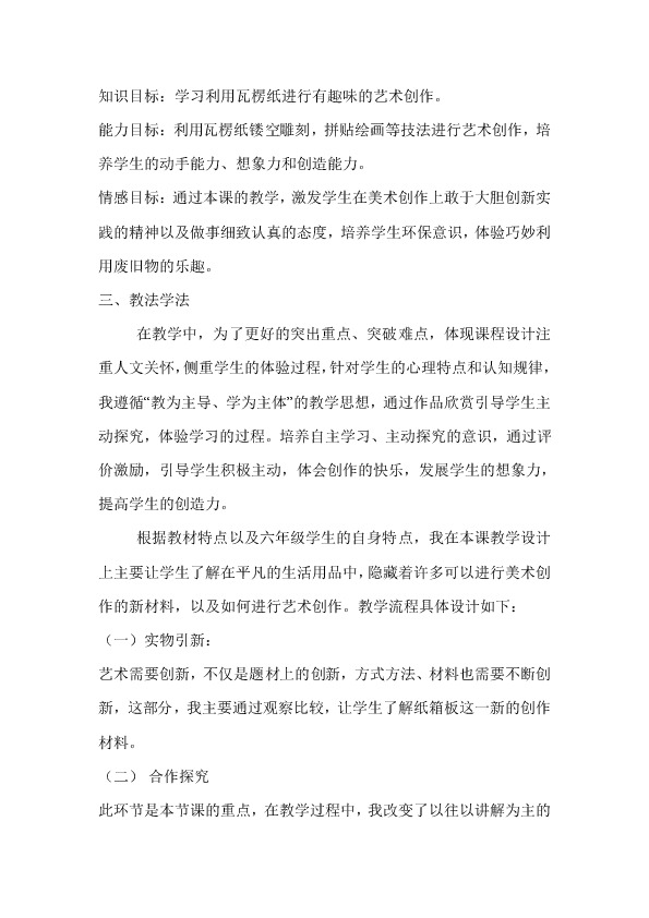 艺术的创作方法是多种多样的,本课旨在使学生更多的了解艺术创作与生活的密切联系。虽然纸箱板对于学生是很熟悉的物品,但是在以往的生活中往往被忽视。本课的教学正是以纸箱板为出发点,学会简单的表现方法,创作出具有独特风格的艺术作品。本节课面对的教学对象是小学六年级的学生,这一学龄儿童是想象力与创造力非常丰富和活跃的时期,结合学龄特点,本着使学生提高对美的感受能力和艺术创造力,我确定本课的教学目标如下: