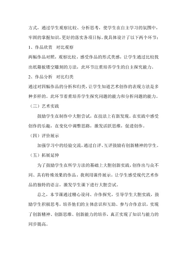 两幅作品对照,观察比较,感受作品的形式美感,让学生通过比较找出纸箱板镂空雕刻的方法,此环节注重培养学生的自主探究能力。