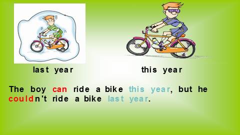 The boy can ride a bike this year, but he couldn't ride a bike last year.