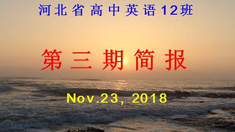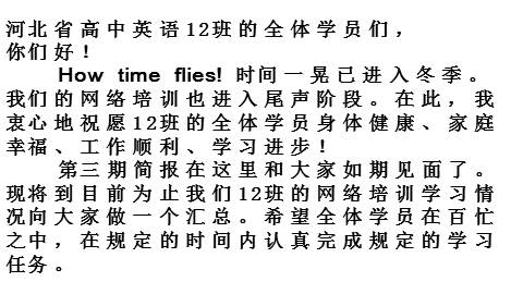 How time flies! 时间一晃已进入冬季。我们的网络培训也进入尾声阶段。在此,我衷心地祝愿12班的全体学员身体健康、家庭幸福、工作顺利、学习进步!