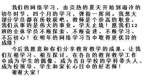 我们的网络学习,由炎热的夏天开始到渐冷的初冬时节,四个月的学习,弹指一挥间。我想大部分学员都有所收获吧。教师是个崇高的职业,我们从事的是伟大的事业。学无止境!愿我们12班的全体学员不断探索、不断奋进、不断学习、不忘初心!在明年的网络学习当中取得更优异的成绩!