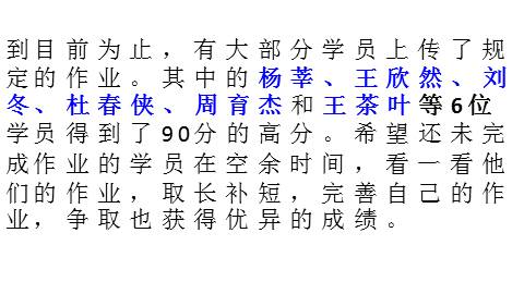 到目前为止,有大部分学员上传了规定的作业。其中的杨某某、王某某、刘某某、杜某某、周育杰和王某某等6位学员得到了90分的高分。希望还未完成作业的学员在空余时间,看一看他们的作业,取长补短,完善自己的作业,争取也获得优异的成绩。