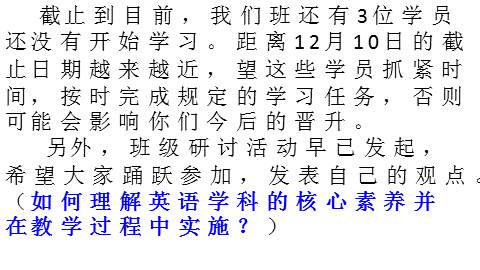 截止到目前,我们班还有3位学员还没有开始学习。距离12月10日的截止日期越来越近,望这些学员抓紧时间,按时完成规定的学习任务,否则可能会影响你们今后的晋升。