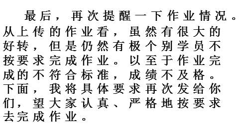 最后,再次提醒一下作业情况。从上传的作业看,虽然有很大的好转,但是仍然有极个别学员不按要求完成作业。以至于作业完成的不符合标准,成绩不及格。下面,我将具体要求再次发给你们,望大家认真、严格地按要求去完成作业。