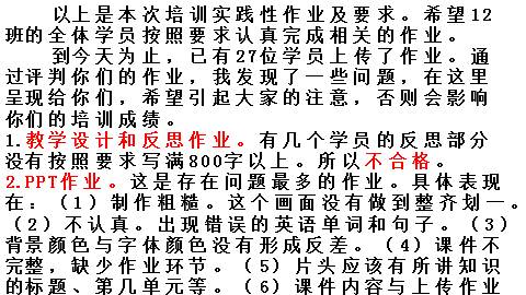1.教学设计和反思作业。有几个学员的反思部分没有按照要求写满800字以上。所以不合格。