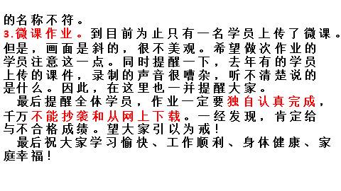 3.微课作业。到目前为止只有一名学员上传了微课。但是,画面是斜的,很不美观。希望做次作业的学员注意这一点。同时提醒一下,去年有的学员上传的课件,录制的声音很嘈杂,听不清楚说的是什么。因此,在这里也一并提醒大家。