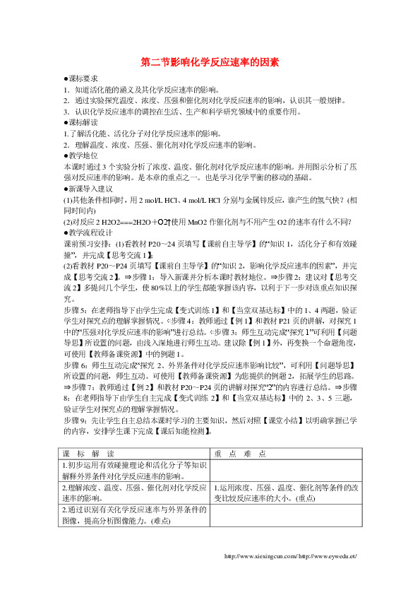 (2)看教材P20~P24页填写【课前自主导学】的“知识2,影响化学反应速率的因素”,并完成【思考交流2】。?步骤1:导入新课并分析本课时教材地位。?步骤2:建议对【思考交流2】多提问几个学生,使80%以上的学生都能掌握该内容,以利于下一步对该重点知识探究。