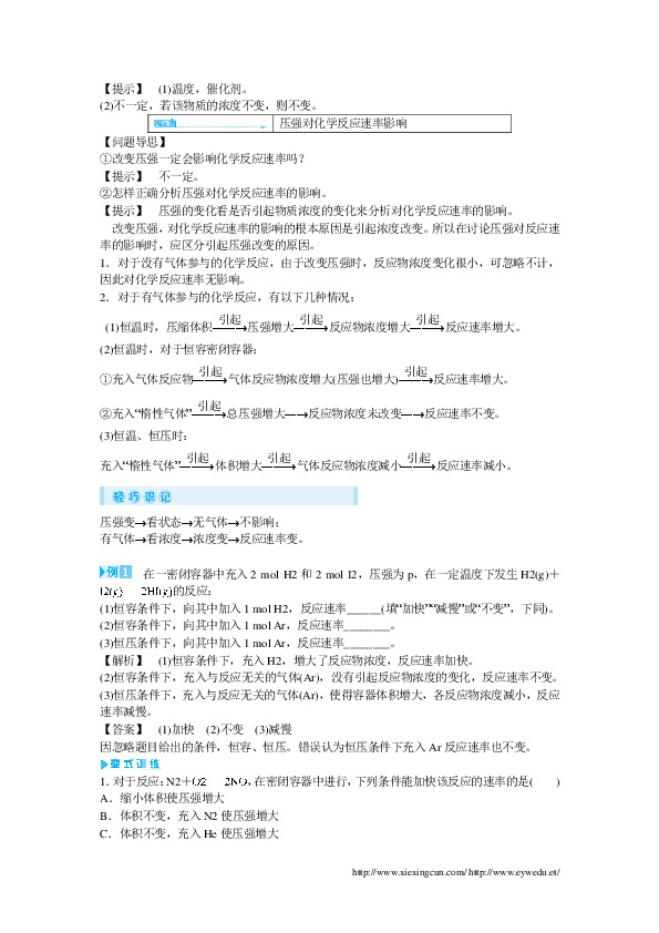 【提示】 压强的变化看是否引起物质浓度的变化来分析对化学反应速率的影响。