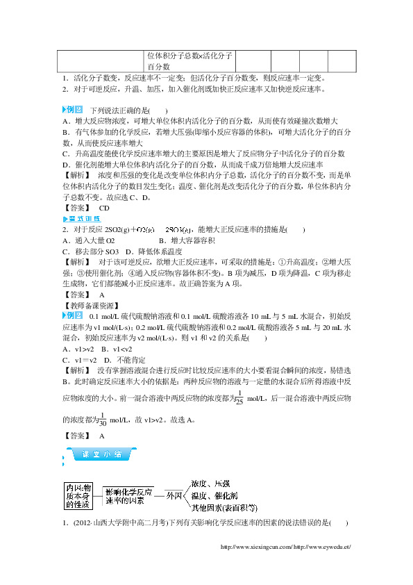 【解析】 其他条件不变,增大反应物浓度,活化分子百分数没有变,但单位体积内活化分子百分数增多,反应速率加快。