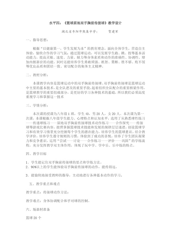 本次课的授课为八年级1班,学生40,男20人,女20人。本次课为第一次课,本课根据八年级学生能力、心理特点和认知水平,选用了从熟悉球性练习——传递球练习——原地双手胸前传接球技术动作练习——合作探究——传接球等游戏比赛内容,按照掌握篮球技术技能和发展的规律层层递进,创设篮球学习和有效学习情景充分挖掘每个学生的潜在能力,培养学生的篮球意识。结合教学评价,培养学生遵守规则的习惯,体验到了成功的喜悦,培养了学生团队凝聚力和竞争意识。运用“尝试——讨论——合作练习——评价——巩固”的学练流程,充分发挥教学双主体作用,体现了玩中学、学中乐、乐中练的特点。