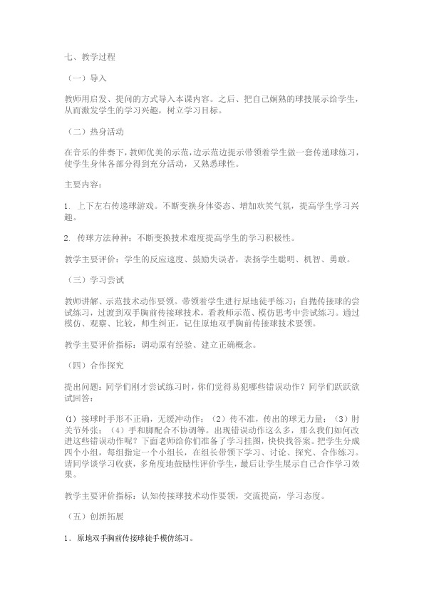 教学主要评价指标:认知传接球技术动作要领,交流提高,学习态度。