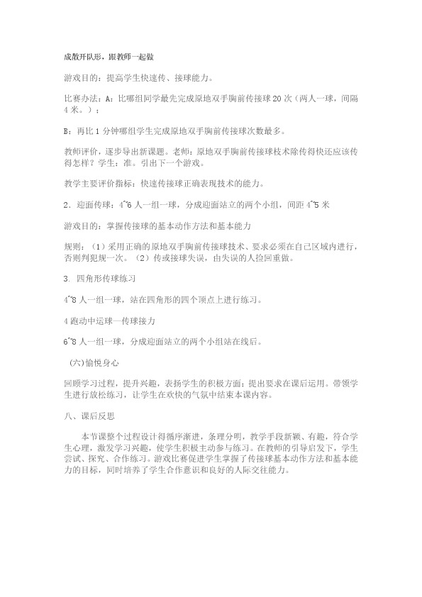 本节课整个过程设计得循序渐进,条理分明,教学手段新颖、有趣,符合学生心理,激发学习兴趣,使学生积极主动参与练习。在教师的引导启发下,学生尝试、探究、合作练习。游戏比赛促进学生掌握了传接球基本动作方法和基本能力的目标,同时培养了学生合作意识和良好的人际交往能力。