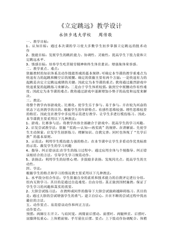 2、技能目标:发展学生的跳跃能力、协调性、灵敏性,提高学生下肢力量和立定跳远水平。