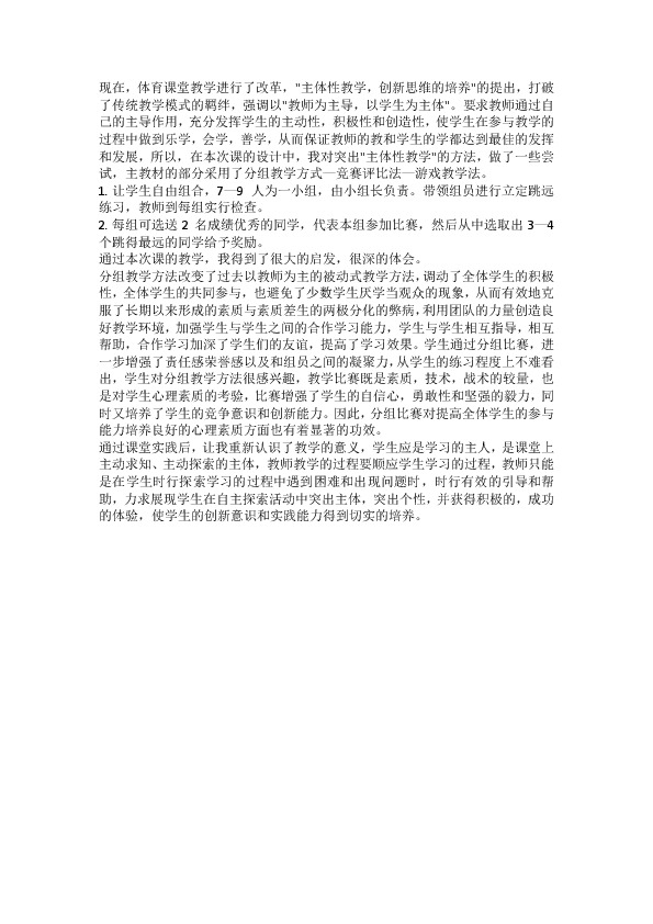 2.?每组可选送2名成绩优秀的同学,代表本组参加比赛,然后从中选取出3—4个跳得最远的同学给予奖励。