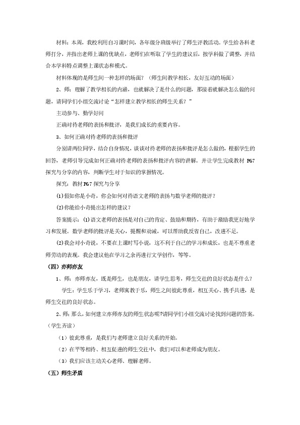 1、师:亦师亦友,既是师生,也是朋友,请学生思考,师生交往的良好状态是什么?