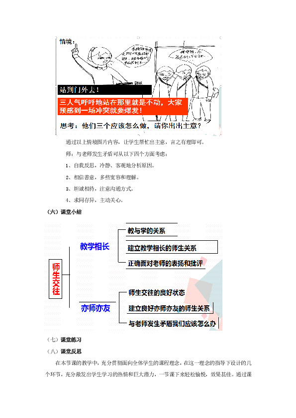师生关系是初中学生成长过程中需要处理的重要关系之一,对培养学生的人际交往能力和促进其健康成长具有重要意义。在现实生活中,学生具有向师性,但部分学生也会对老师产生质疑。由于老师和学生的角色差异,师生之间可能产生矛盾和冲突,因此,通过本课的学习,要引导学生理解老师、体谅老师、尊敬老师,从而达成师生和谐、亦师亦友的亲密关系,落实以人为本的理念。