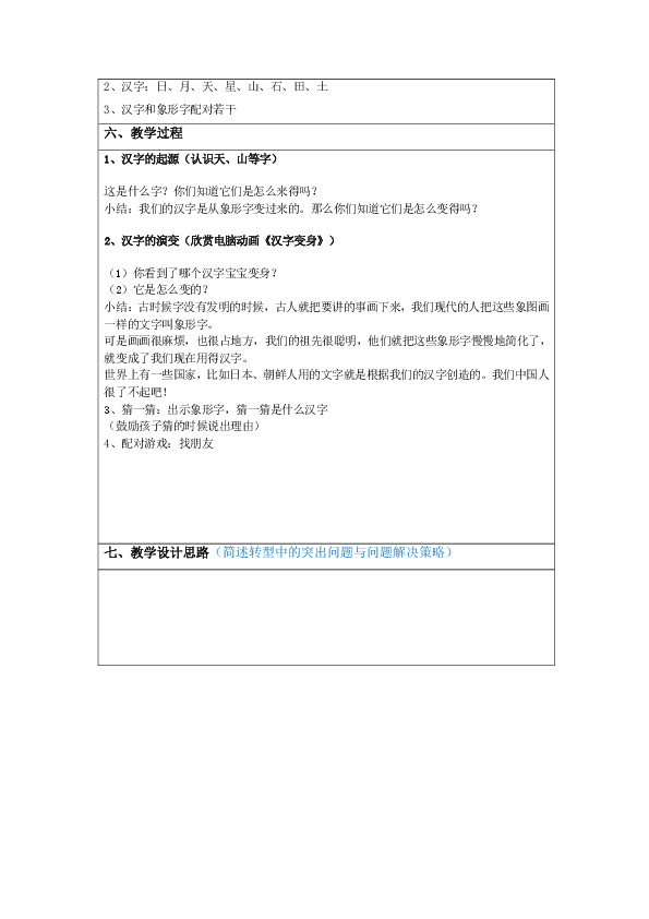 1、电脑动画《汉字变身》,2、汉字:日、月、天、星、山、石、田、土3、汉字和象形字配对若干