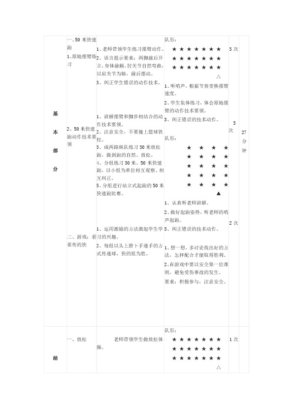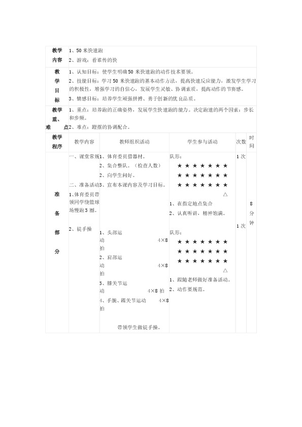 2、技能目标:学习50米快速跑的基本动作方法,提高快速反应能力,激发学生学习的积极性,增强学习的自信心,发展学生灵敏、协调素质,提高动作的节奏感。