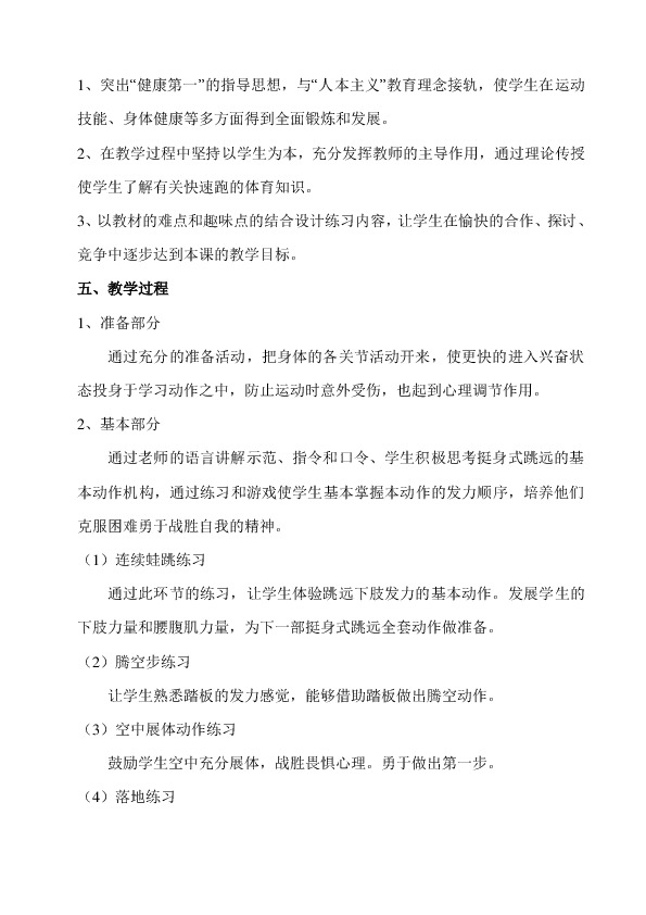 通过老师的语言讲解示范、指令和口令、学生积极思考挺身式跳远的基本动作机构,通过练习和游戏使学生基本掌握本动作的发力顺序,培养他们克服困难勇于战胜自我的精神。