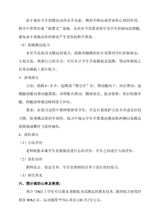 预计75%以上学生可以基本掌握挺身式跳远的基本技术,课的练习密度控制在60%左右,运动强度平均心率在130次/分左右。
