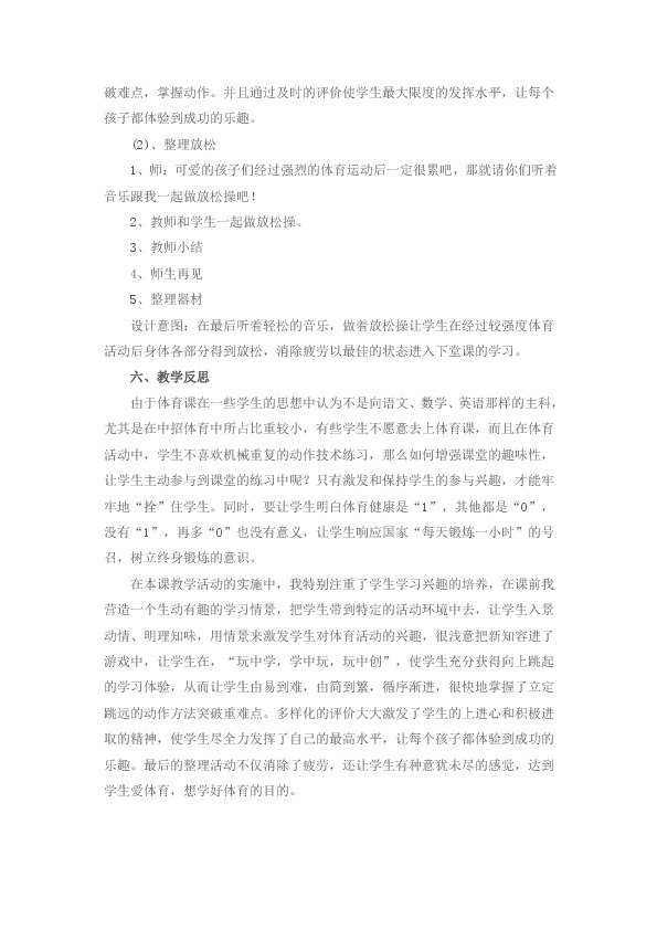 在本课教学活动的实施中,我特别注重了学生学习兴趣的培养,在课前我营造一个生动有趣的学习情景,把学生带到特定的活动环境中去,让学生入景动情、明理知味,用情景来激发学生对体育活动的兴趣,很浅意把新知容进了游戏中,让学生在,“玩中学,学中玩,玩中创”,使学生充分获得向上跳起的学习体验,从而让学生由易到难,由简到繁,循序渐进,很快地掌握了立定跳远的动作方法突破重难点。多样化的评价大大激发了学生的上进心和积极进取的精神,使学生尽全力发挥了自己的最高水平,让每个孩子都体验到成功的乐趣。最后的整理活动不仅消除了疲劳,还让学生有种意犹未尽的感觉,达到学生爱体育,想学好体育的目的。