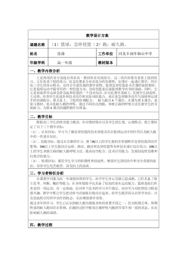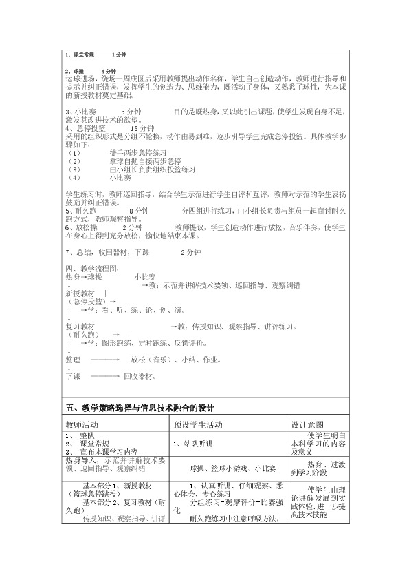 (2)、技能目标:通过本次课的学习,使70%以上的学生能初步掌握跨步急停投篮的动作要领;50%以上学生能结合运球、移动、跑动和急停投篮等各种技术进行综合练习;80%以上的学生掌握正确的耐久跑呼吸方法。提高动作配合、技术应用能力,发展创造性思维和自我评价能力。