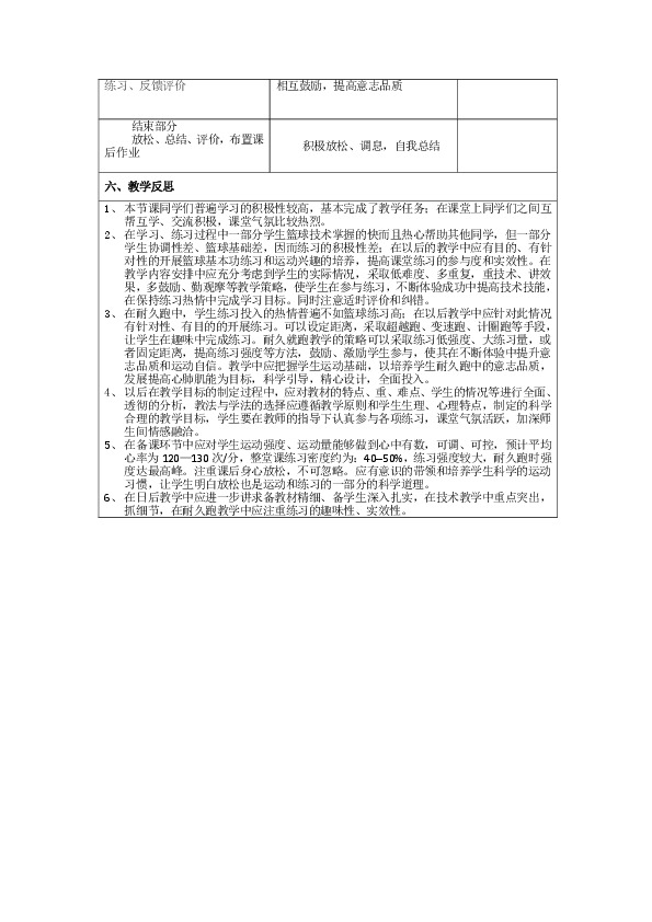 在备课环节中应对学生运动强度、运动量能够做到心中有数,可调、可控,预计平均心率为120—130次/分,整堂课练习密度约为:40--50%,练习强度较大,耐久跑时强度达最高峰。注重课后身心放松,不可忽略。应有意识的带领和培养学生科学的运动习惯,让学生明白放松也是运动和练习的一部分的科学道理。