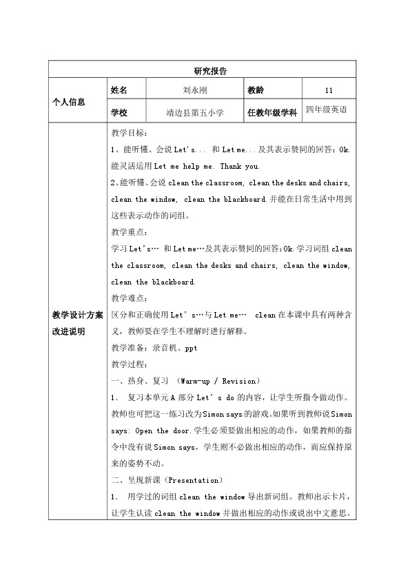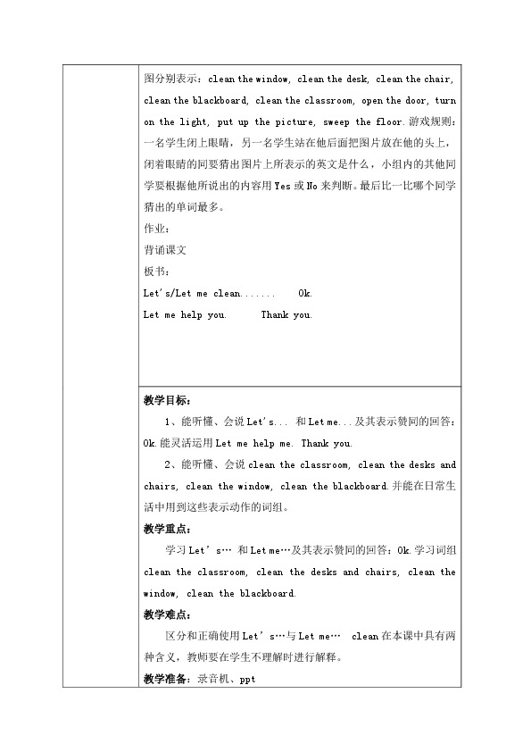 2、能听懂、会说clean the classroom, clean the desks and chairs, clean the window, clean the blackboard.并能在日常生活中用到这些表示动作的词组。