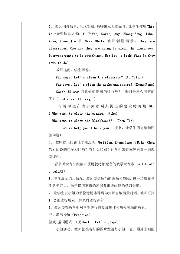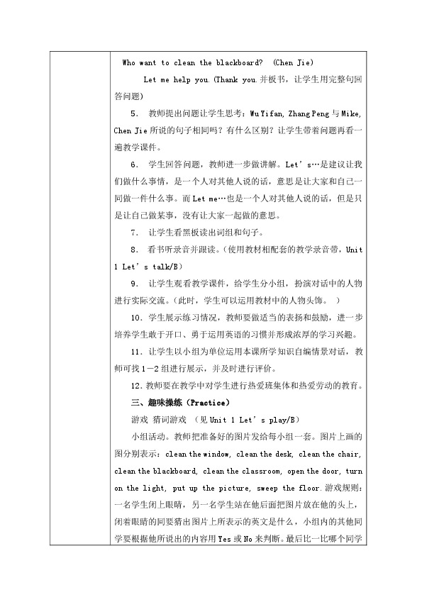 小组活动。教师把准备好的图片发给每小组一套。图片上画的图分别表示:clean the window, clean the desk, clean the chair, clean the blackboard, clean the classroom, open the door, turn on the light, put up the picture, sweep the floor.游戏规则:一名学生闭上眼晴,另一名学生站在他后面把图片放在他的头上,闭着眼睛的同要猜出图片上所表示的英文是什么,小组内的其他同学要根据他所说出的内容用Yes或No来判断。最后比一比哪个同学猜出的单词最多。
