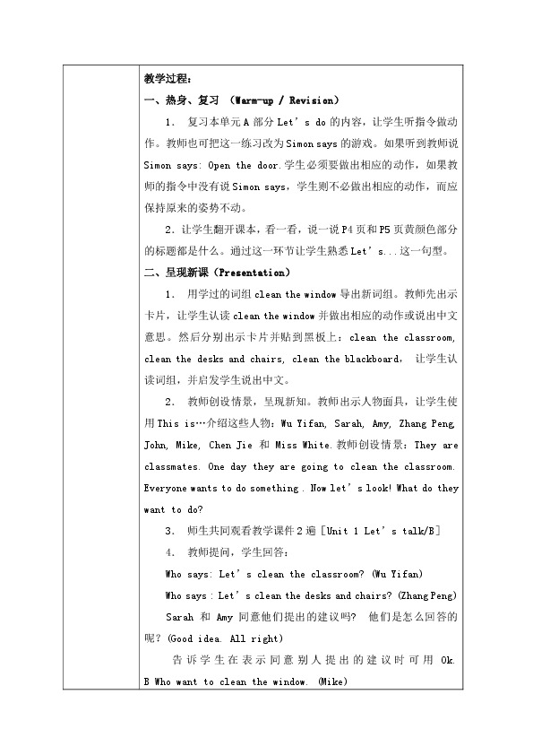 学习Let’sXXXXX 和Let meXXXXX及其表示赞同的回答:Ok.学习词组clean the classroom, clean the desks and chairs, clean the window, clean the blackboard.