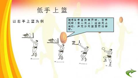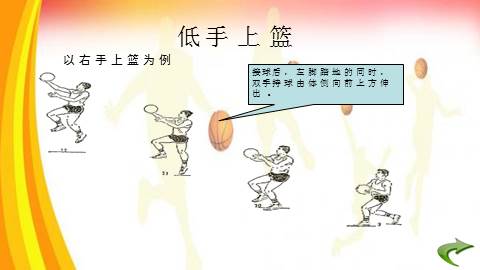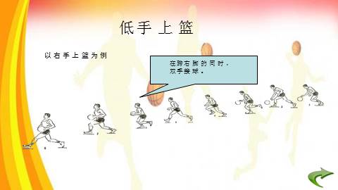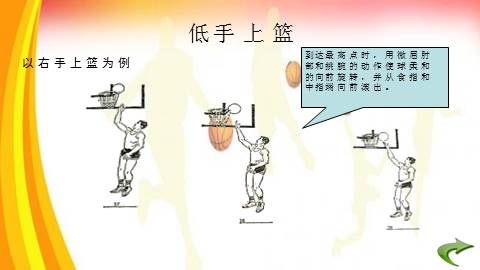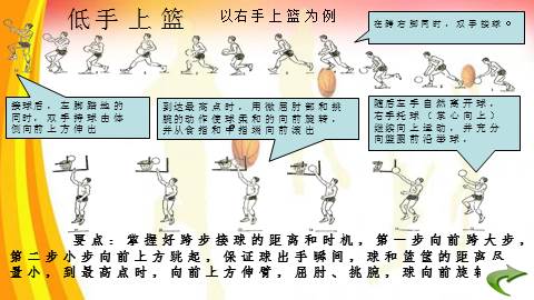 以右手上篮为例低手上篮以右手上篮为例在跨右脚的同时,