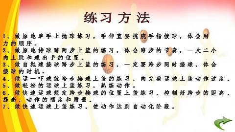 2、做原地持球跨两步上篮的练习,体会跨步的节奏,一大二小