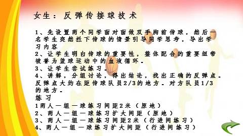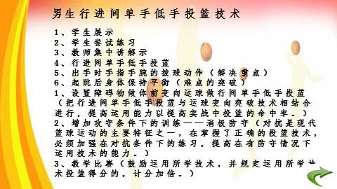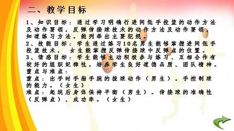 2、技能目标:学生通过练习10名男生能够掌握进间低手投篮技术, 女生能掌握反弹传接球中反弹点的位置。