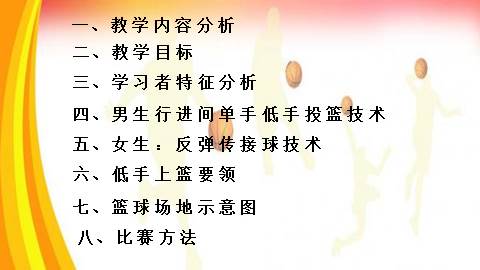 篮球技术 秦皇岛市特殊教育学校 王某某一、教学内容分析 二、教学目标 三、学习者特征分析 六、低手上篮要领七、篮球场地示意图八、比赛方法四、男生行进间单手低手投篮技术五、女生:反弹传接球技术本节课的教材选自省编《体育与健康》,篮球运动深受广大中学生喜爱,通过篮球运动可以发展学生跑、跳、投等基本活动能力,提高灵敏、协调、速度、力量、耐力等素质,培养学生勇敢、顽强、机智、果断等优秀品质。