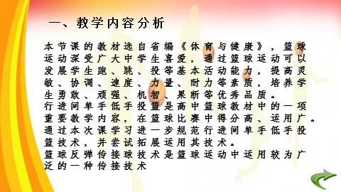 篮球反弹传接球技术是篮球运动中运用较为广泛的一种传接技术 一、教学内容分析 二、教学目标 1、知识目标:通过学习明确行进间低手投篮的动作方法及动作要领,反弹传接球技术的动作方法及动作要领,知道练习方法。能列举出主要犯规。