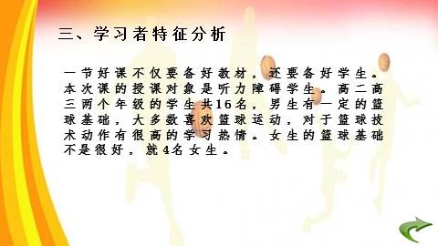难点:起跳后身体保持平衡(男生)。传接球的准确性(反弹点)、成功率。(女生) 一节好课不仅要备好教材,还要备好学生。本次课的授课对象是听力障碍学生。高二高三两个年级的学生共16名,男生有一定的篮球基础,大多数喜欢篮球运动,对于篮球技术动作有很高的学习热情。女生的篮球基础不是很好,就4名女生。 三、学习者特征分析 低手上篮接球后,左脚踏地的同时,双手持球由体侧向前上方伸出 随后左手自然离开球,右手托球(掌心向上)继续向上运动,并充分向篮圈前沿举球, 到达最高点时,用微屈某某部和挑腕的动作使球柔和的向前旋转,并从食指和中指端向前滚出 要点:掌握好跨步接球的距离和时机,第一步向前跨大步,第二步小步向前上方跳起,保证球出手瞬间,球和篮筐的距离尽量小,到最高点时,向前上方伸臂,屈某某、挑腕,球向前旋转。在跨右脚同时,双手接球。