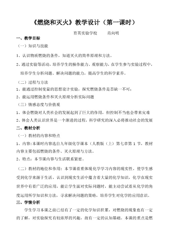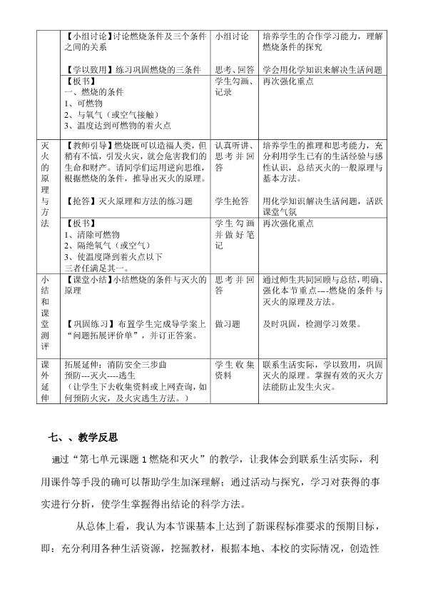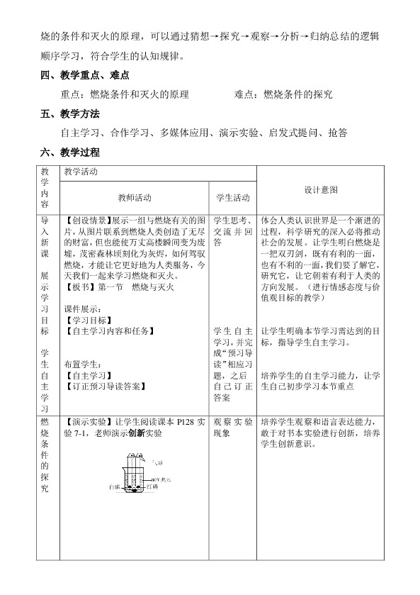 1、内容:本课时内容选自九年级化学课本(人教版(上)第七章第1节,教材内容主要包括燃烧的条件、灭火原理与方法。