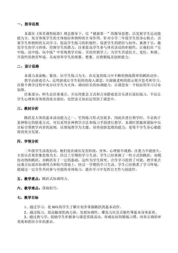 二年级学生活泼好动,他们处在成长发育阶段,身体、心理很不成熟,注意力不能持久,主要以直观形象思维为主。经过上学期的学习生活,学生已经掌握了一些方式的跳跃,如模仿动物的跳跃,对跳跃有了一定的基础,这些为学生探究、合作学习提供了可能,教学重点应难点应放在协调用力和轻巧落地上。经过一学期的学习生活,学生已经熟悉了学习环境,能通过一定合作共同参与可能的身体练习,能在学习中发挥自主性与创造性。