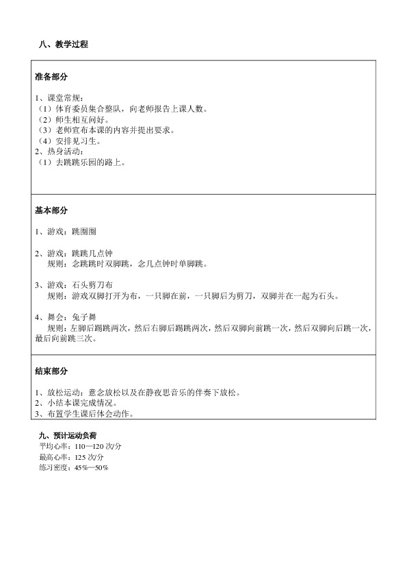 本课力求流畅、紧凑。以学生练习为主,在反复的练习中不断的熟练简单的跳跃动作。