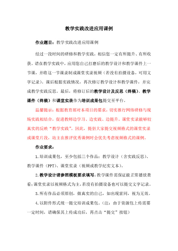 1.培训成果包,至少包括三个作品:教学设计(含实践反思)、教学课件(PPT)、课堂实录(视频或教学纪实文本)。