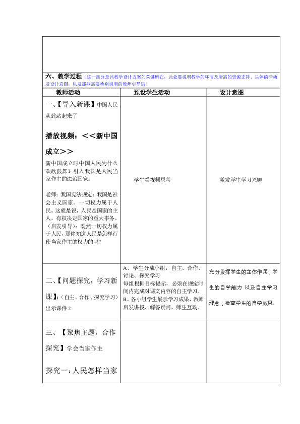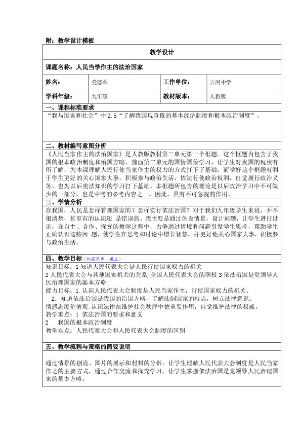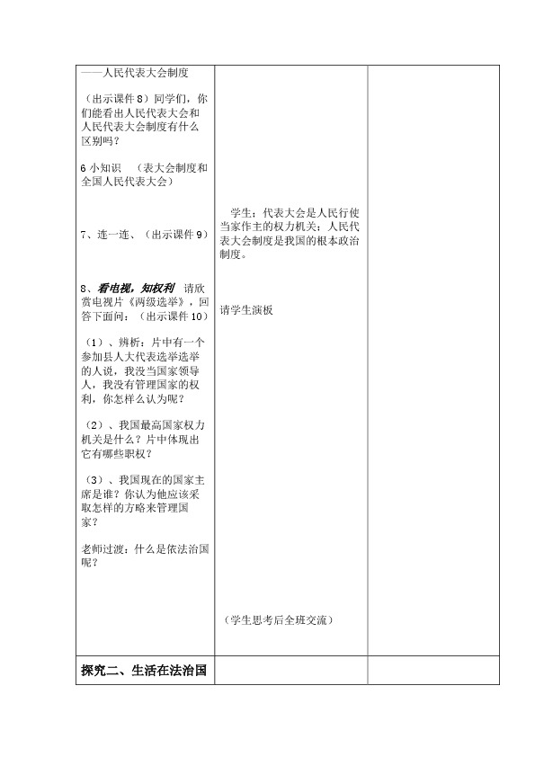 通过情景的创设、图片的展示和材料的分析。让学生理解人民代表大会制度是人民当家作之的主要方式,通过合作交流和探究学习,让学生掌握依法治国是党领导人民治理国家的基本方略。