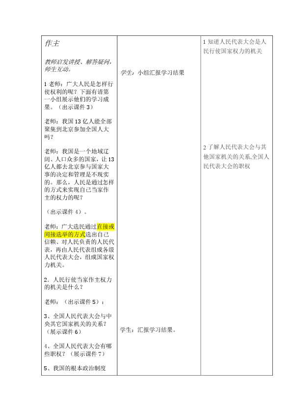 能力目标:1.认识人民代表大会制度是人民当家作主,行使国家权力的机关。