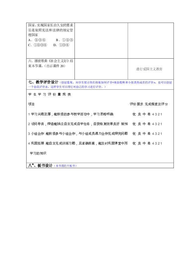 七、教学评价设计(创建量规,向学生展示他们将被如何评价<来自教师和小组其他成员的评价>,也可以创建一个自我评价表,这样学生可以用它对自己的学习进行评价。)