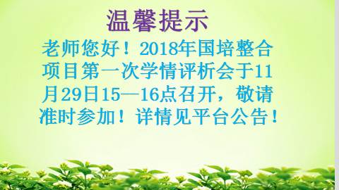 老师您好!2018年国培整合项目第一次学情评析会于11月29日15--16点召开,敬请准时参加!详情见平台公告!