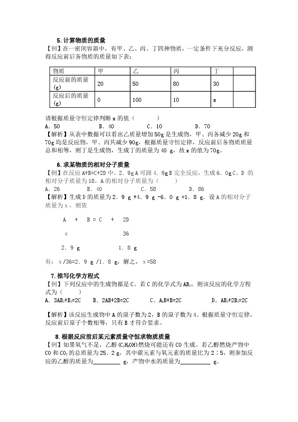 6.求某物质的相对分子质量 【例】在反应A+B=C+2D中,2.9g A可跟4.9g B完全反应,生成6.0g C,D 的相对分子质量为18,A的相对分子质量为(?? ) A.26???? B.40?????? C.58????? D.86 【解析】生成D的质量为2.9 g +4.9 g -6.0 g =1.8 g.设A的相对分子质量为x,则依?