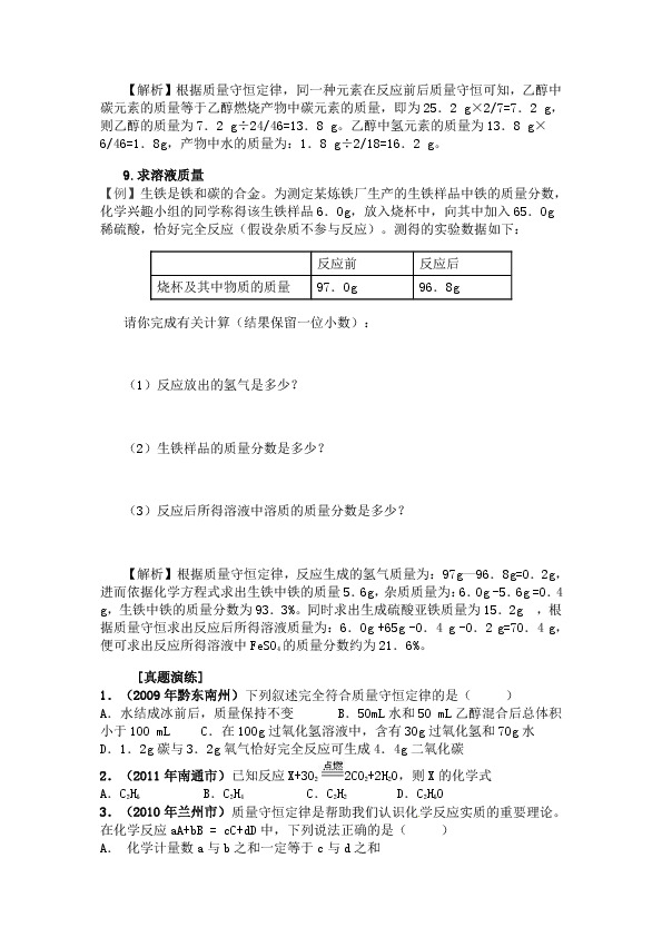 ?[真题演练] 1.(2009年黔东南州)下列叙述完全符合质量守恒定律的是(?? )***A.水结成冰前后,质量保持不变***B.50mL水和50 mL乙醇混合后总体积小于100 mL学科C.在100g过氧化氢溶液中,含有30g过氧化氢和70g水学科D.1.2g碳与3.2g氧气恰好完全反应可生成4.4g二氧化碳 2.(2011年南通市)已知反应X+3O22CO2+2H2O,则X的化学式 A.C2H6????????? B.C2H4????????? C.C2H2??????? D.C2H60 3.(2010年兰州市)质量守恒定律是帮助我们认识化学反应实质的重要理论。在化学反应aA+bB = cC+dD中,下列说法正确的是(?? ) A. 化学计量数a与b之和一定等于c与d之和 B. 若取xg A和xg B反应,生成C和D的质量总和不一定是2xg C.反应物A和B的质量比一定等于生成物C和D的质量比 D. 若A和C都是盐,则该反应一定是复分解反应