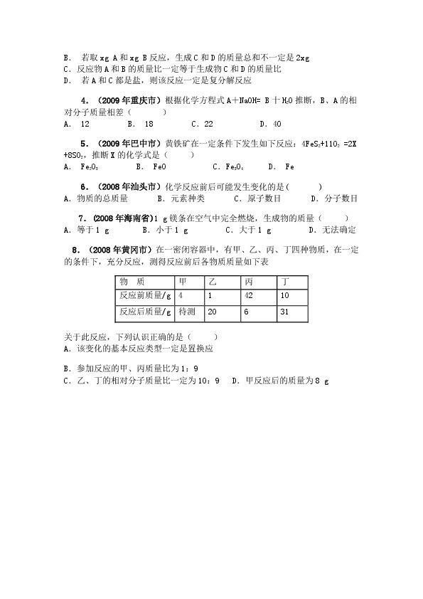 8.(2008年黄某某)在一密闭容器中,有甲、乙、丙、丁四种物质,在一定的条件下,充分反应,测得反应前后各物质质量如下表