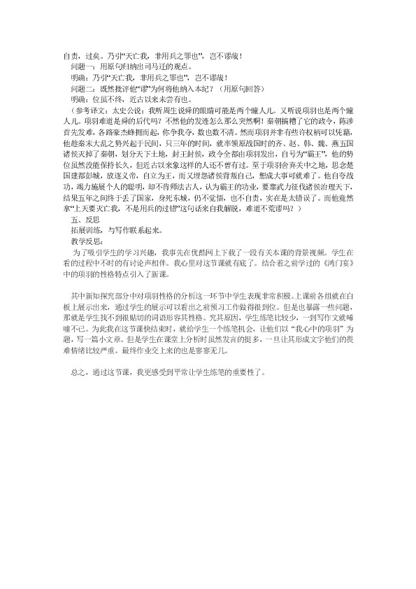 ?为了吸引学生的学习兴趣,我事先在优酷网上下载了一段有关本课的背景视频。学生在看的过程中不时的有讨论声相伴。我心里对这节课就有底了。结合着之前学过的《鸿门宴》中的项羽的性格特点引入了新课。????其中新知探究部分中对项羽性格的分析这一环节中学生表现非常积极。上课前各组就在白板上展示出来,通过学生的展示可以看出之前预习工作做得很到位。但是也暴露一些问题,那就是学生找不到很贴切的词语形容其性格。究其原因,学生练笔比较少,一到写作文就唏嘘不已。为此我在这节课快结束时,就给学生一个练笔机会,让他们以“我心中的项羽”为题,写一篇小文章。但是学生在课堂上分析时虽然发言的挺多,一旦让其形成文字他们的畏难情绪比较严重。最终作业交上来的也是寥寥无几。????总之,通过这节课,我更感受到平常让学生练笔的重要性了。