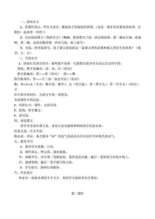 3、交流:检查标段号,读了课文你知道这一篇课文讲的是谁和谁之间发生的故事?(板书:大、小)